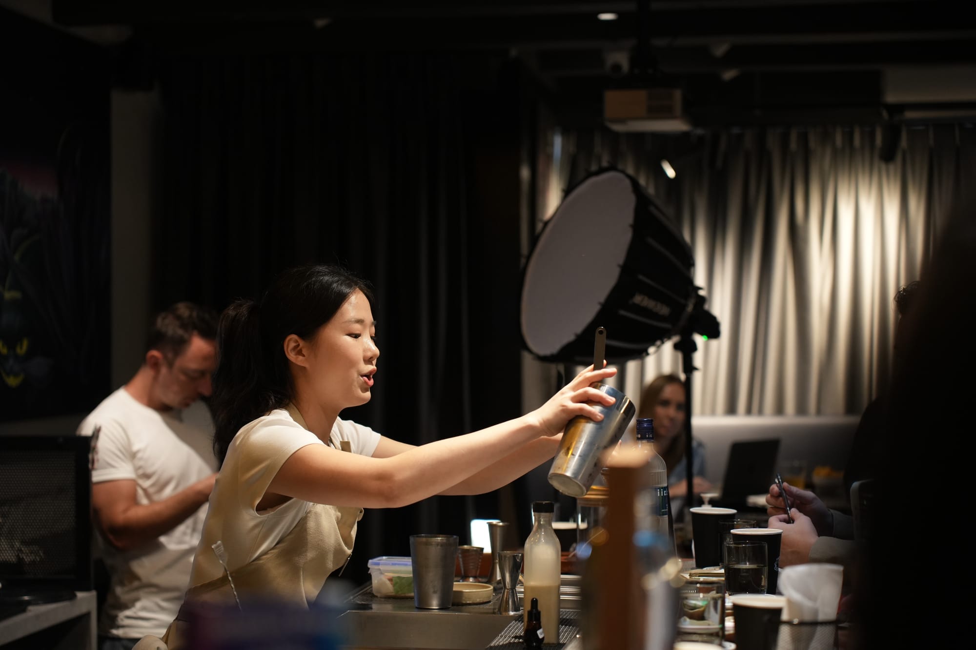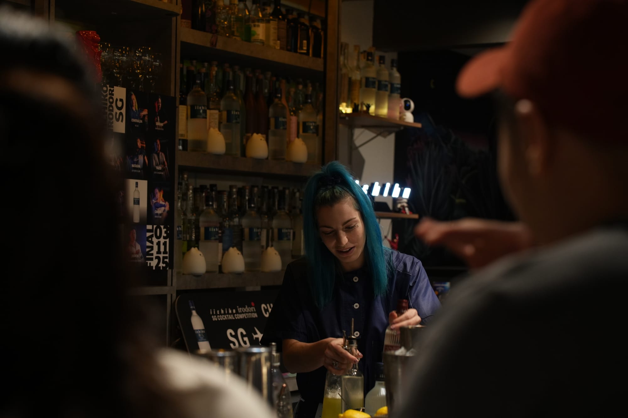Tomorrow she would be graded on a few scales including sustainability (?), technicality, her presentation of the drink as well as the taste of her drink. These competitions are occasionally hosted by various liquor companies (this one by the Japanese iichiko), so when we walked in to Chinatown’s Cat Bite Bar we were greeted by several tall bottles of iichiko shochu, all ready for the bartenders to use in their drinks.